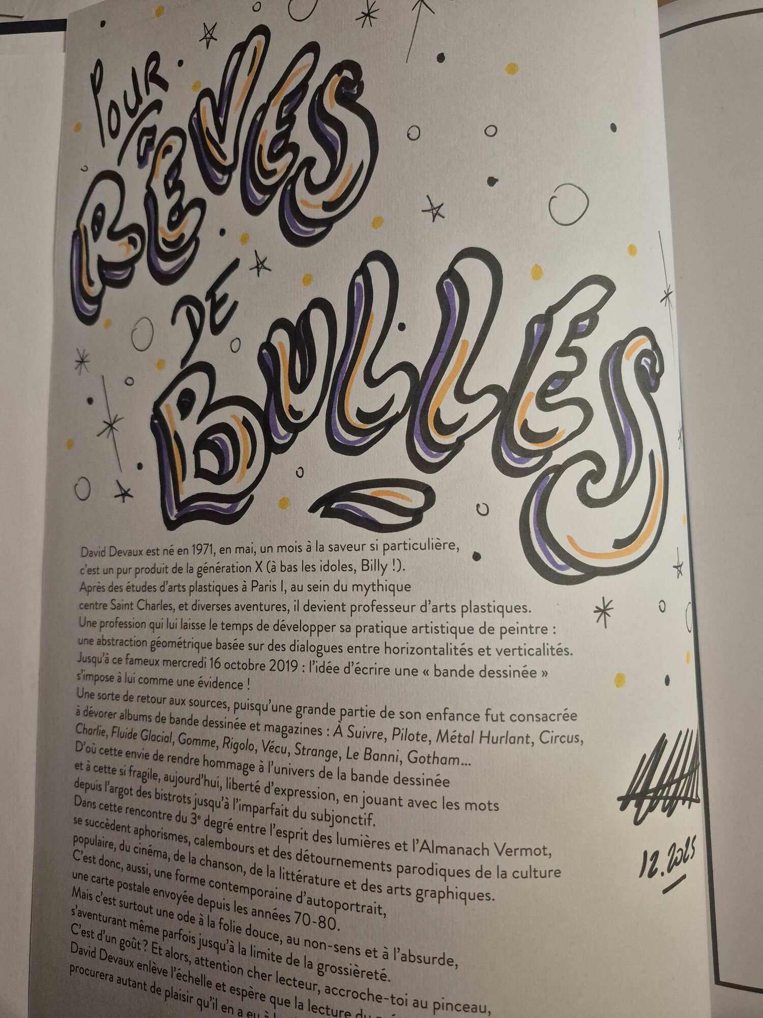 Ce bel album est dédicacé par l’auteur en décembre 2025, David Devaux, « Pour Rêves de Bulles ».