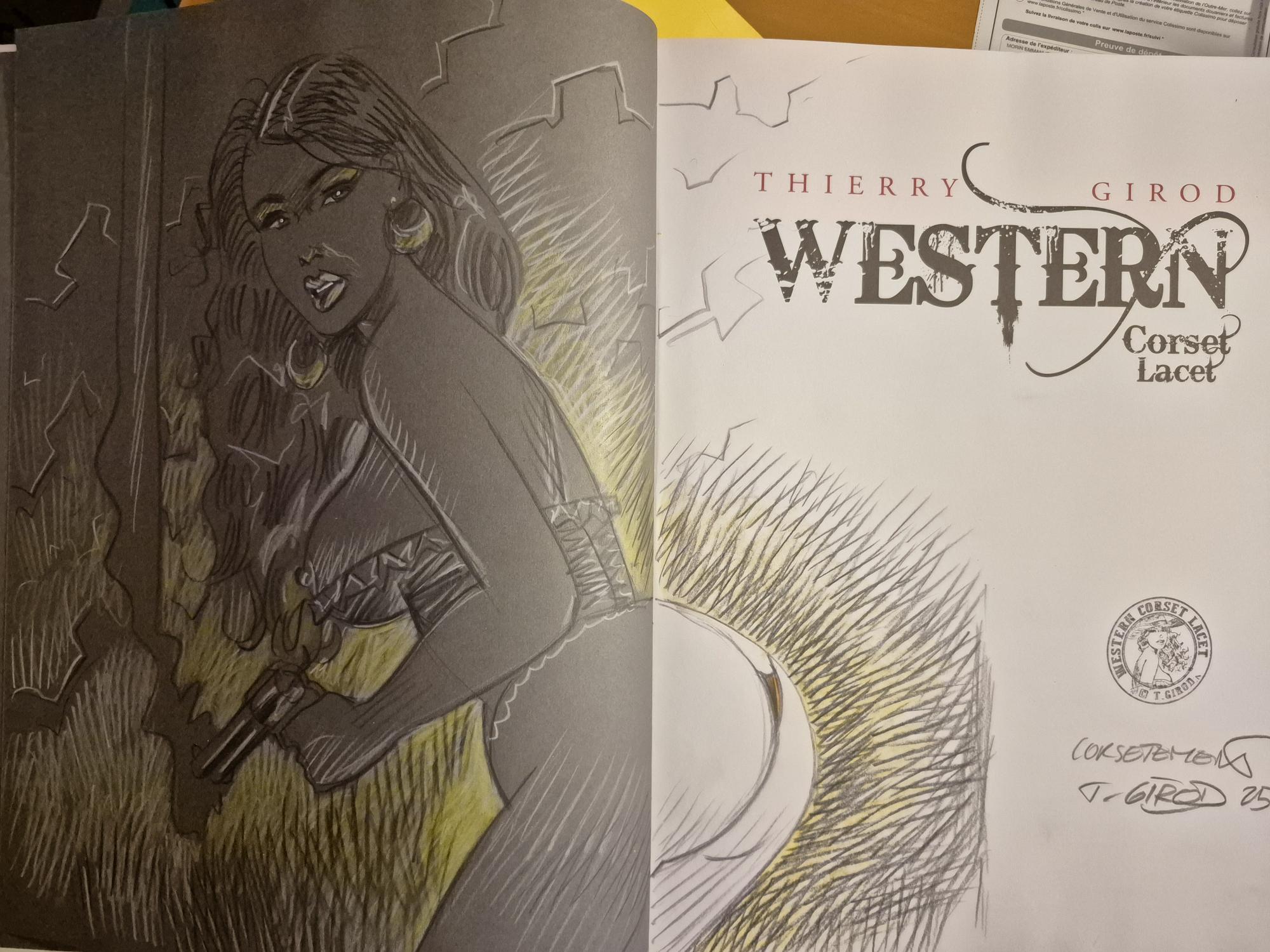Voici un superbe exemplaire de « Wanted Corset Lacet », tirage de luxe (2019) toilé rouge pailleté. Il est surtout dédicacé par Thierry Girod sur deux pages en couleurs en 2025. Splendide !